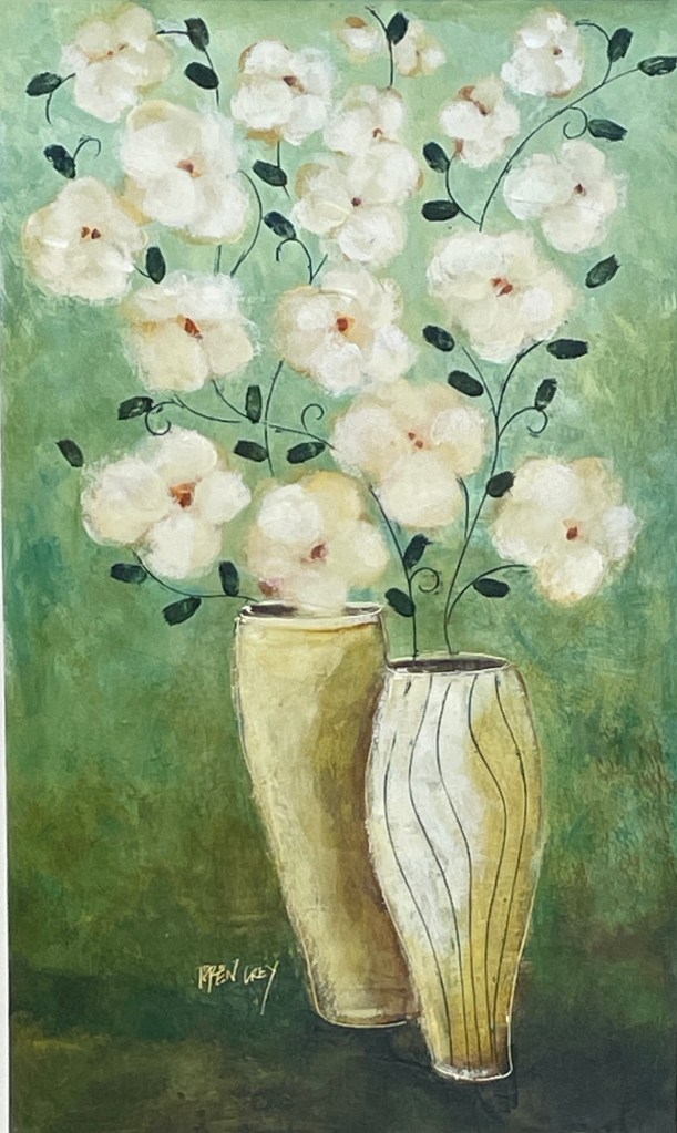 Two vases anchor this composition, their forms softened by wax and pigment as white blooms stretch upward in quiet motion. The lime-toned background adds a gentle vibrancy, contrasting the dark stems and textured petals. Loren Grey’s encaustic technique brings a luminous depth to the piece, echoing her training at the Winchester School of Art and her reputation for contemporary elegance across UK and American galleries.