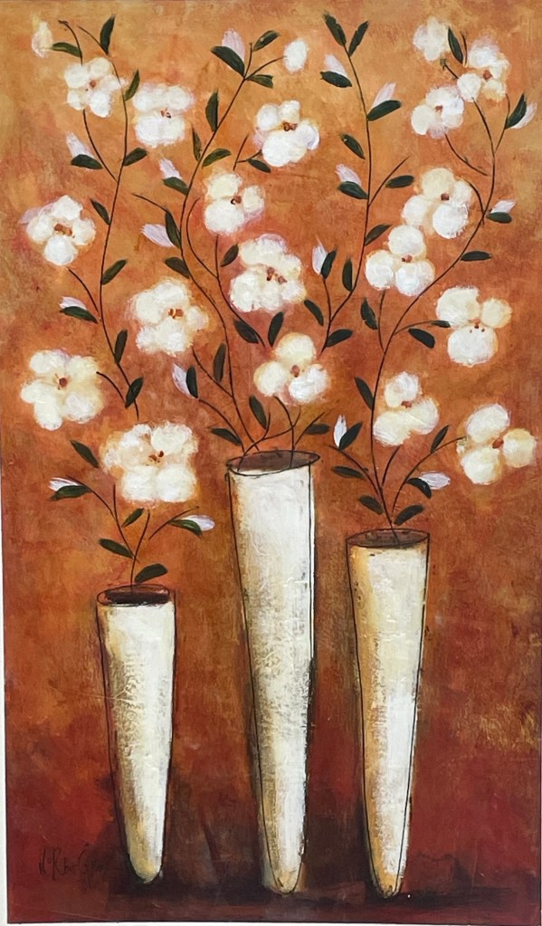 A trio of slender vases rises in quiet harmony, each cradling soft white blooms against a warm, textured backdrop. Loren Grey’s signature style—layered washes of wax and paint—brings depth and movement to this elegant composition. Trained at the Winchester School of Art in England, Grey is known for her dramatic use of color and contemporary balance. Her works have been exhibited across the UK, from the Bath Lanes Gallery to the Beecroft in Essex