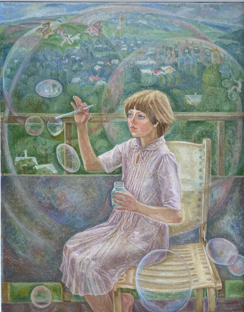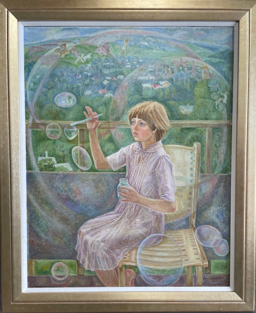 A young figure sits quietly on a sunlit terrace, blowing soap bubbles into a dreamlike sky. Each translucent orb carries a whimsical scene—flying figures, animals, and fragments of imagined worlds—hovering above a lush, distant village. Galina’s brushwork blends realism with surreal storytelling, inviting viewers into a moment of stillness and wonder. The painting’s title, Peace, resonates not only through its gentle palette and composition, but as a poignant reflection of hope amid uncertainty.