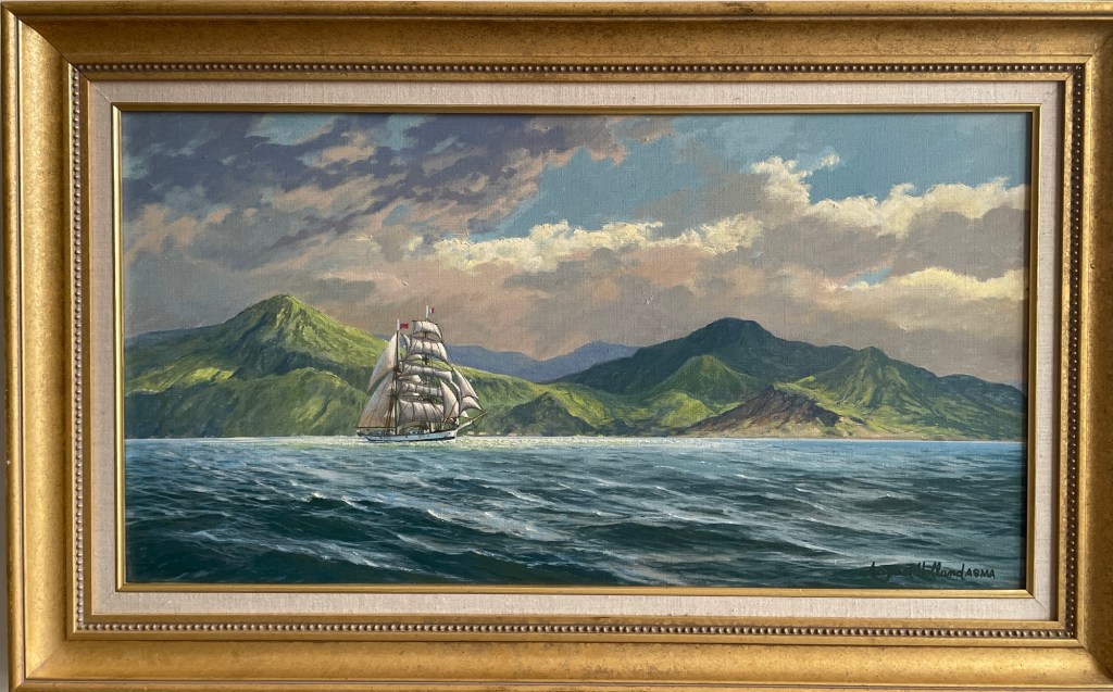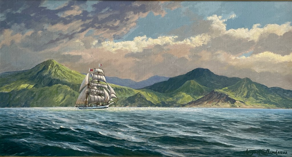 A tranquil voyage rendered in luminous detail—this multi-masted ship glides past Tahitian peaks under a sky alive with light. Holland, a member of the American Society of Marine Artists, evokes both motion and serenity in this timeless seascape.