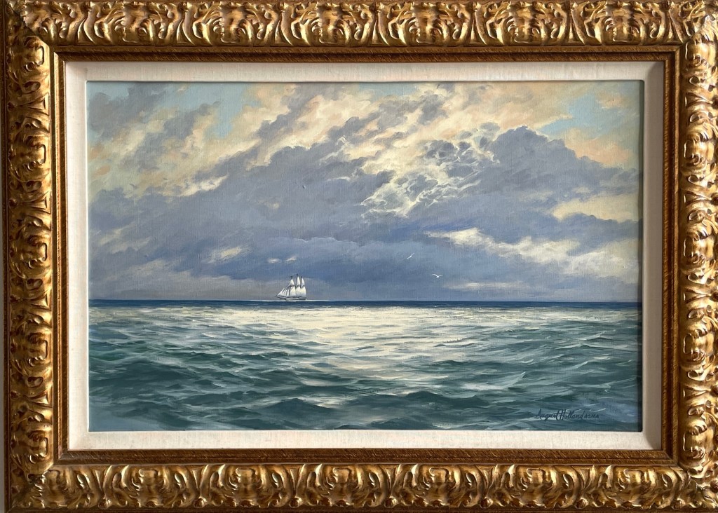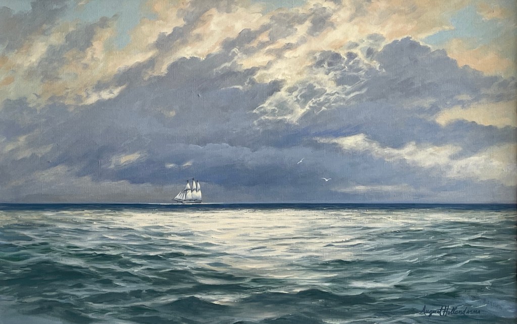 A solitary ship glides across calm waters beneath a sky alive with light and motion. Holland’s mastery of atmosphere and maritime detail invites quiet reflection and timeless escape.