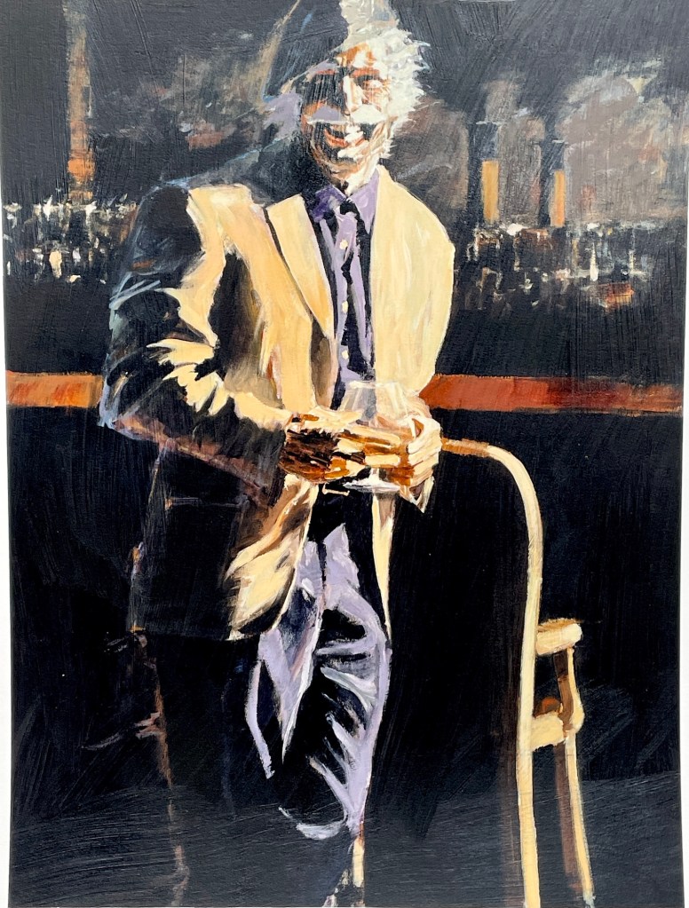 Aldo Luongo’s expressive brushwork and moody palette capture more than a moment—they evoke a lifetime of charisma, reflection, and quiet strength. This piece features The Hawk, Luongo’s enduring archetype inspired by his late father, Rafael. The Hawk represents the artist’s ideal man: graceful, magnetic, and contemplative. Often seen leaning into solitude or savoring a drink, he’s a figure of timeless charm and emotional depth.