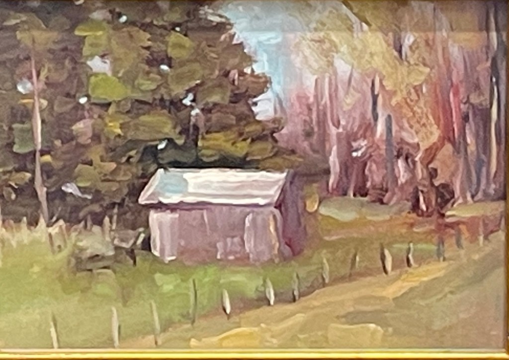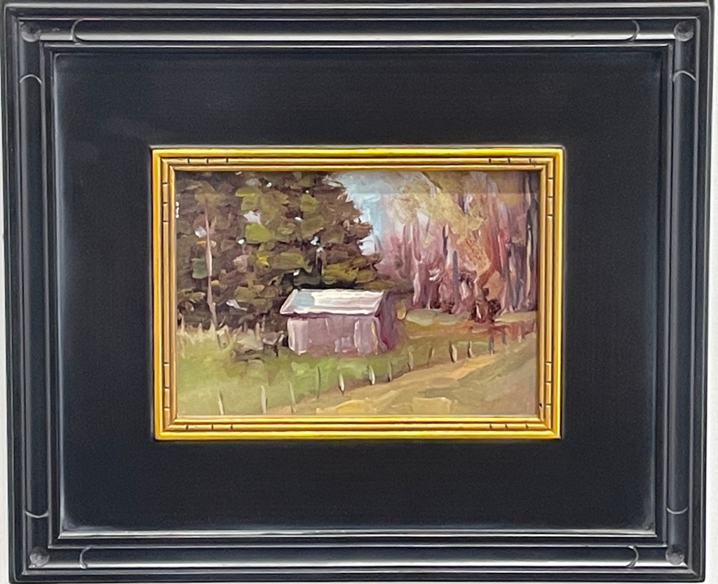 A roadside shed, golden light, and the hush of Iowa countryside. Painted on location, this intimate work by Brian Parr distills a moment of rural stillness—where trees lean in and fences mark memory more than boundary.