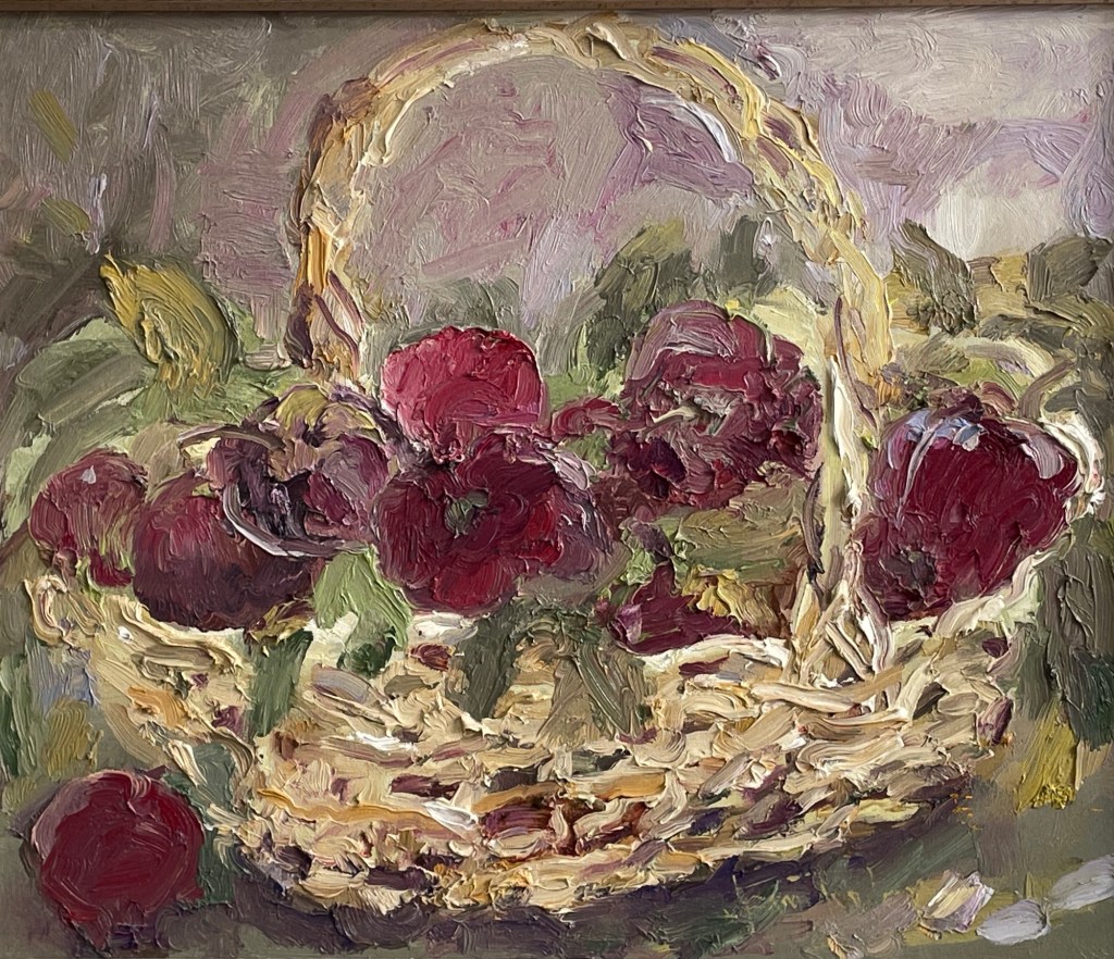 Jean Turley’s “Basket of Apples” (20” x 24”) captures the timeless charm of still life with thick, expressive brushwork and radiant color. The woven basket and glossy apples emerge from the canvas in rich impasto, inviting viewers into a moment of rustic abundance. Framed in gold, it’s a celebration of texture, tradition, and painterly warmth.