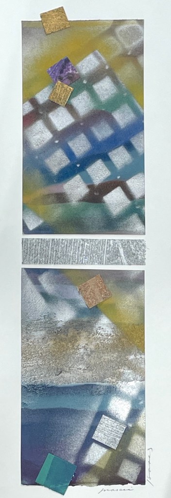 A study in movement and material, Forward invites the viewer into a dialogue of texture, color, and form. Isaacs’ vertical diptych pulses with layered geometry—grids, metallics, and organic fragments coexisting in quiet tension. The title suggests momentum, yet the composition holds space for reflection.