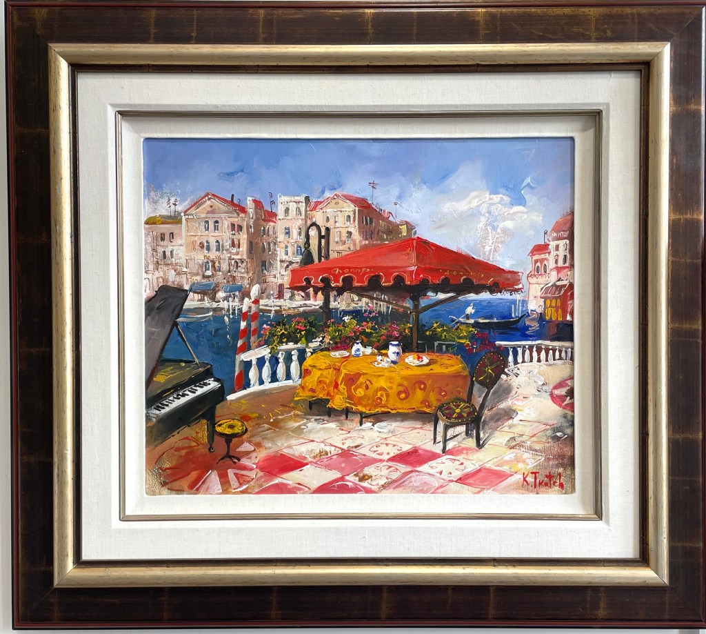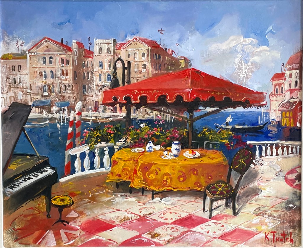 A sun-drenched café tableau unfolds in Venice Scene by Kim Tkatch, where checkerboard tiles, a grand piano, and gondolas drift through a dreamlike waterfront. This original oil painting (20” x 24”) captures the warmth and intimacy of European leisure with saturated color and lyrical detail — from the yellow tablecloth to the red umbrella’s shade. Tkatch’s brush invites you into a moment of music, conversation, and timeless charm.