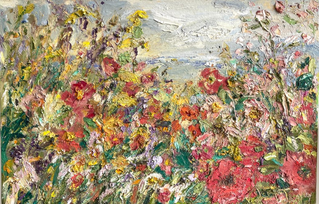 Jean Turley’s “Wildflower Garden” (24” x 36”) bursts with color and movement, a joyful tribute to nature’s spontaneity. Thick, expressive brushstrokes bring each bloom to life, while the soft sky backdrop adds serenity to the vibrant field. A textured celebration of wild beauty, captured in oil.