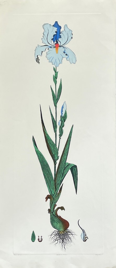 A striking vertical study of the iris in cool tones—Mitra’s etching balances stylized elegance with botanical insight. Ruffled petals in icy blue and violet rise from a twisting stem, rooted in quiet mystery.