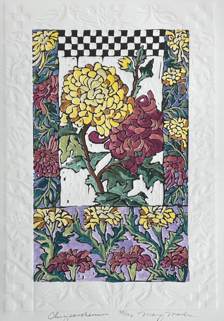 A vibrant interplay of geometry and bloom—Mary Mark’s Chrysanthemums pairs bold checkerboard contrast with stylized floral repetition. The embossed border adds a sculptural touch, framing yellow and red blossoms in layered harmony. Signed and numbered, this limited edition print invites both visual and tactile appreciation.
