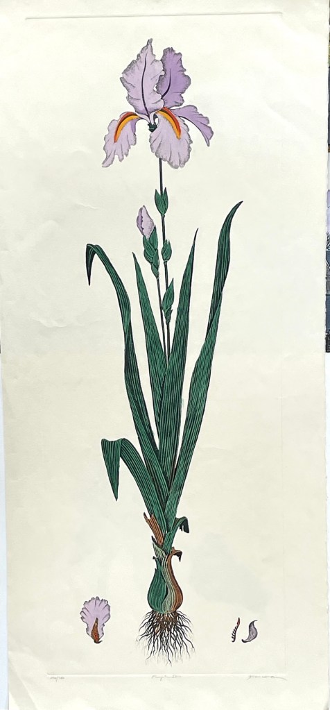 A graceful vertical study of the iris in bloom—Mitra’s etching captures botanical elegance from petal to root. Delicate lavender tones meet crisp anatomical detail, offering both beauty and insight.