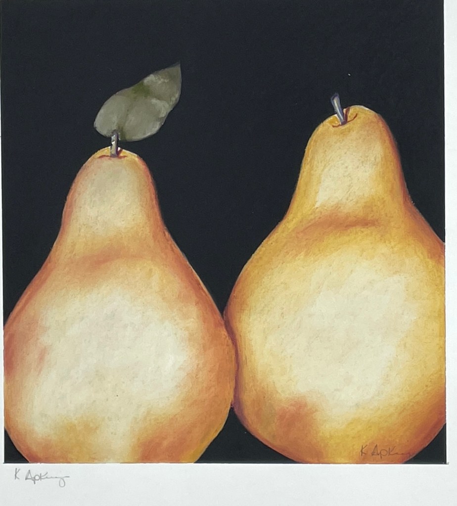 Art, Botanical Two Pears by Kay Apking Posted by kagwdm on October 30, 2025 Kay Apking Two Pears, acrylic on paper 14” x 13” A quiet duet in golden tones—Apking’s pears glow against a velvety black backdrop, their soft curves and subtle highlights evoking warmth, simplicity, and timeless still life tradition. Share this: Click to share on X (Opens in new window) X Click to share on Facebook (Opens in new window) Facebook More Click to email a link to a friend (Opens in new window) Email Click to share on Threads (Opens in new window) Threads Like Loading...