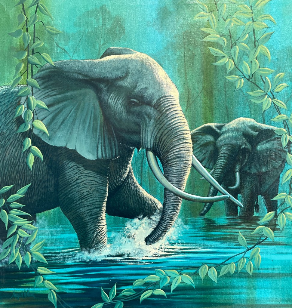 This 40” x 40” oil on canvas by August Holland captures the quiet majesty of elephants wading through a lush, vine-framed oasis. A moment of peace, rendered with depth and reverence.