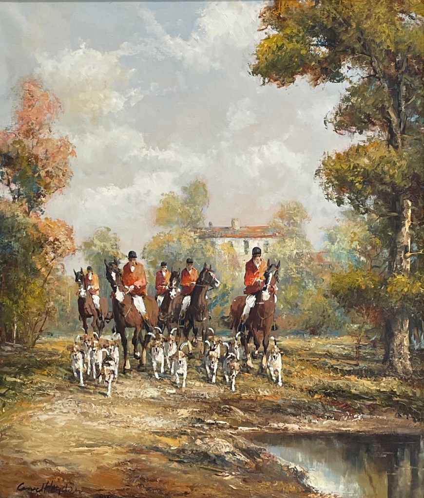 A crisp autumn chase captured in vivid oil—Kurt Heyden’s Hunt Scene (24” x 20”) channels the thrill and tradition of the countryside pursuit. Riders in scarlet, hounds in motion, and golden foliage evoke a timeless narrative of sport and ceremony. Available now for $750.
