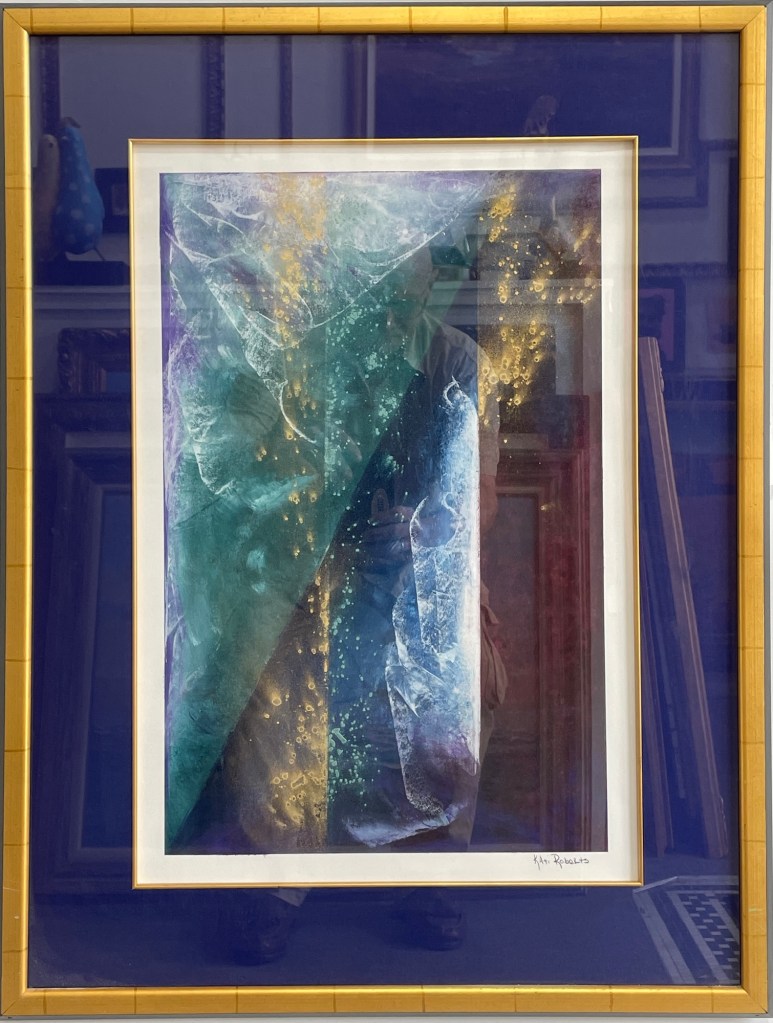 A luminous exploration of texture and light, Celestial Drift by Kati Roberts blends deep blues, translucent veils, and scattered gold to create a visual experience that feels both grounded and otherworldly. The composition invites reflection and interpretation, with layered elements that shift as you move. Elegantly framed with blue matting and gold trim, this piece is a standout for collectors drawn to abstract works with emotional depth.
