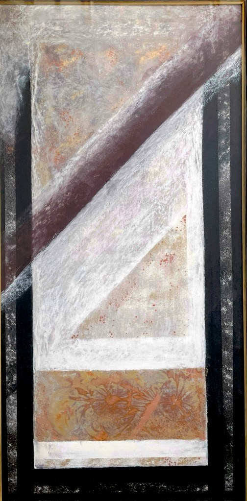 A striking interplay of diagonal tension and organic texture, Geometry of Science explores the emotional resonance of structure. Kati Roberts blends geometric precision with layered surface treatments, creating a visual rhythm that feels both architectural and intuitive. The composition invites contemplation—where logic meets mystery, and form becomes feeling.