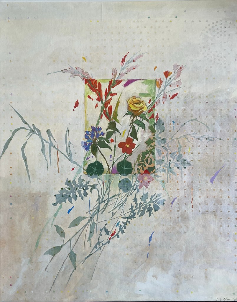 A bouquet that breaks its borders—Abstracted Floral pulses with color and elegance. Working in layers, Don Bradshaw invites viewers to linger in the subtle tension between botanical clarity and expressive blur. The central floral panel radiates with reds, yellows, and greens, dissolving into a soft, abstract field of scattered marks and muted tones. A meditation on nature’s resilience and fragility.
