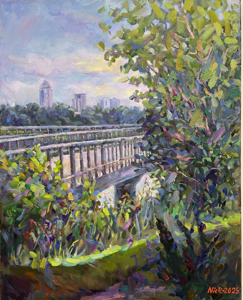A layered view of downtown Des Moines, East of the River captures the city’s skyline as seen from the lush banks beyond the bridge. Nick Proykov’s impressionistic brushwork blends architectural rhythm with natural texture, creating a composition that feels both grounded and atmospheric. The pastel sky suggests early light or fading dusk—moments when the city softens and the landscape speaks.