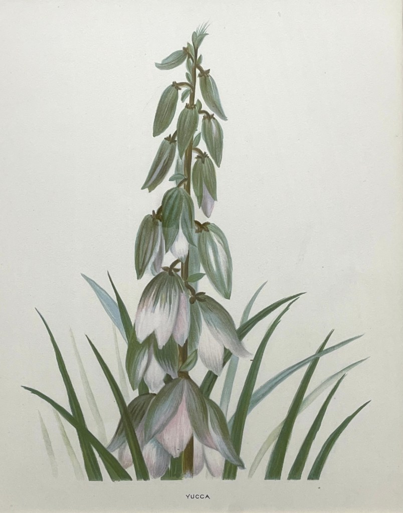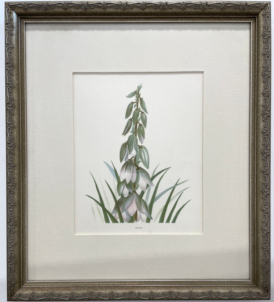Yucca — a crisp botanical illustration that celebrates the sculptural beauty of this desert bloom. Delicate bell-shaped flowers rise from a crown of pointed green leaves, rendered with scientific clarity and artistic grace. Framed in silver with white matting, this piece measures 10” x 8” (18” x 16” framed) and is available for $275. A perfect accent for collectors drawn to natural forms, vintage studies, and timeless design.