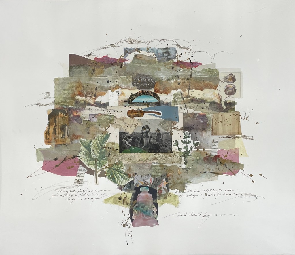 A lyrical meditation on time, memory, and the land—Joanna Rafferty’s collage invites viewers into a circular narrative where image and text intertwine. Handwritten fragments like “from the beginning of time…” and “the story…” echo across landscapes and faces, creating a visual symphony of history and emotion. This piece bridges personal and collective memory, offering a tactile, poetic experience.