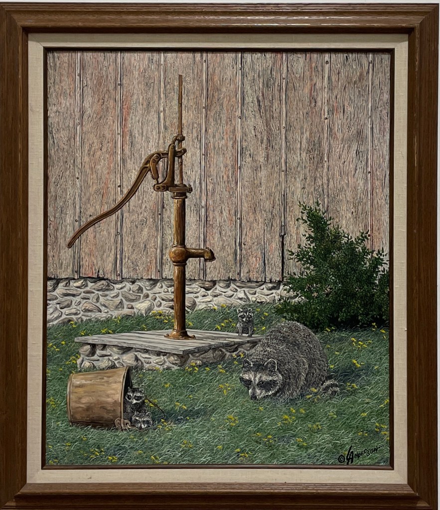 A quiet moment in the countryside—this charming wildlife scene features a raccoon family nestled beside a hand pump and tipped wooden bucket, framed by golden blooms and rustic textures. Anderson’s brushwork evokes warmth, curiosity, and the timeless rhythm of rural life.