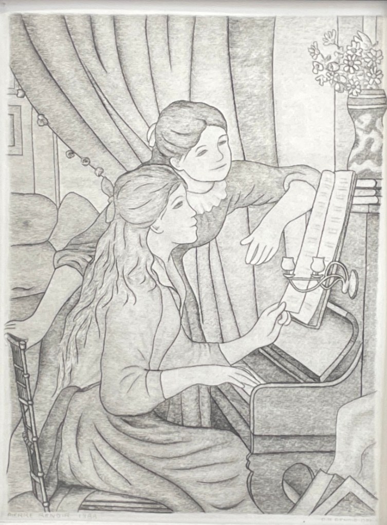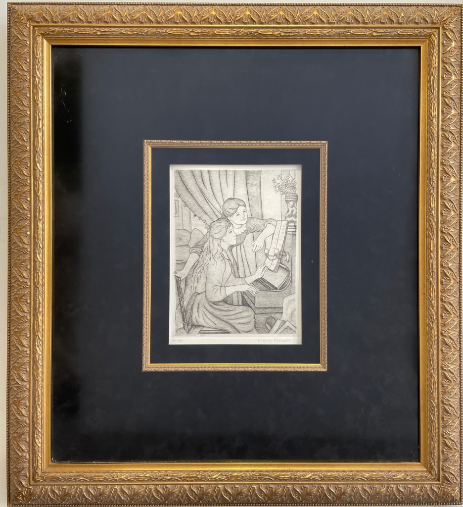 Les Jeunes Filles au Piano by Pierre Renoir — a lyrical etching that captures an intimate musical moment between two young women. Pierre Renoir, grandson of the iconic Pierre-Auguste Renoir, inherited a keen eye for emotion and detail. This work echoes the elegance of 19th-century domestic life, framed in ornate gold leaf with double matting to enhance its classical charm. A rare and evocative piece for collectors who value lineage, atmosphere, and timeless beauty.