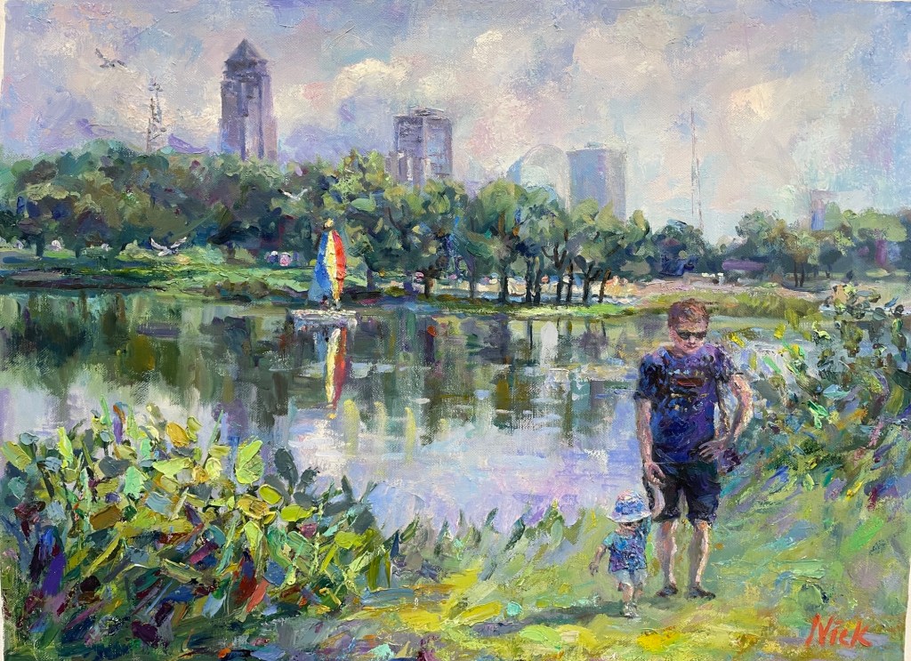 A tender walk along Grays Lake, where nature meets skyline and memory meets motion. In Steps Toward the City, Nick Proykov captures a fleeting moment between a man and child—perhaps father and daughter—framed by soft light, lush greens, and the distant hum of Des Moines. The sailboat rests quietly across the water, a symbol of pause in a world that’s always moving. This 16” x 22” oil painting invites reflection, nostalgia, and the beauty of shared silence.