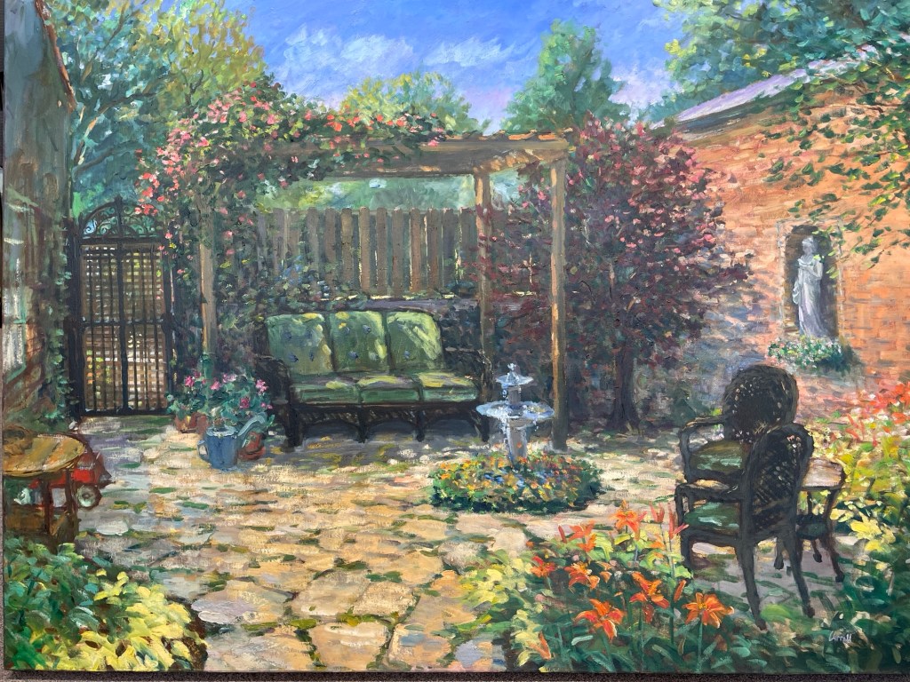 A sanctuary of stillness and bloom—this lush garden patio scene invites quiet reflection and warm conversation. Carroll’s masterful brushwork captures the interplay of stone, foliage, and filtered light, creating a timeless escape just beyond the gate. A celebration of serenity, scale, and Midwestern elegance.