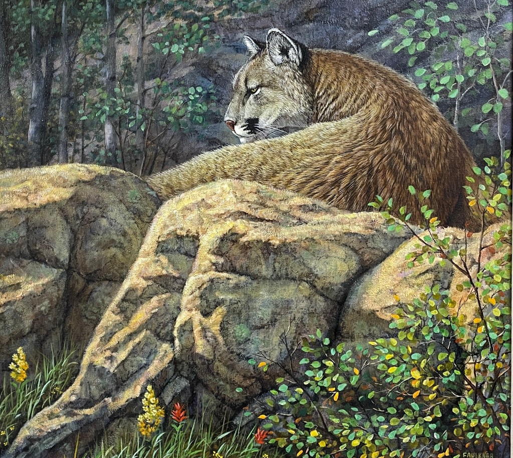 A moment of stillness in the wild—James Faulkner’s Cougar captures the feline grace of a mountain lion at rest. Framed by forest textures and golden light, this piece blends realism with reverence for nature’s quiet strength.