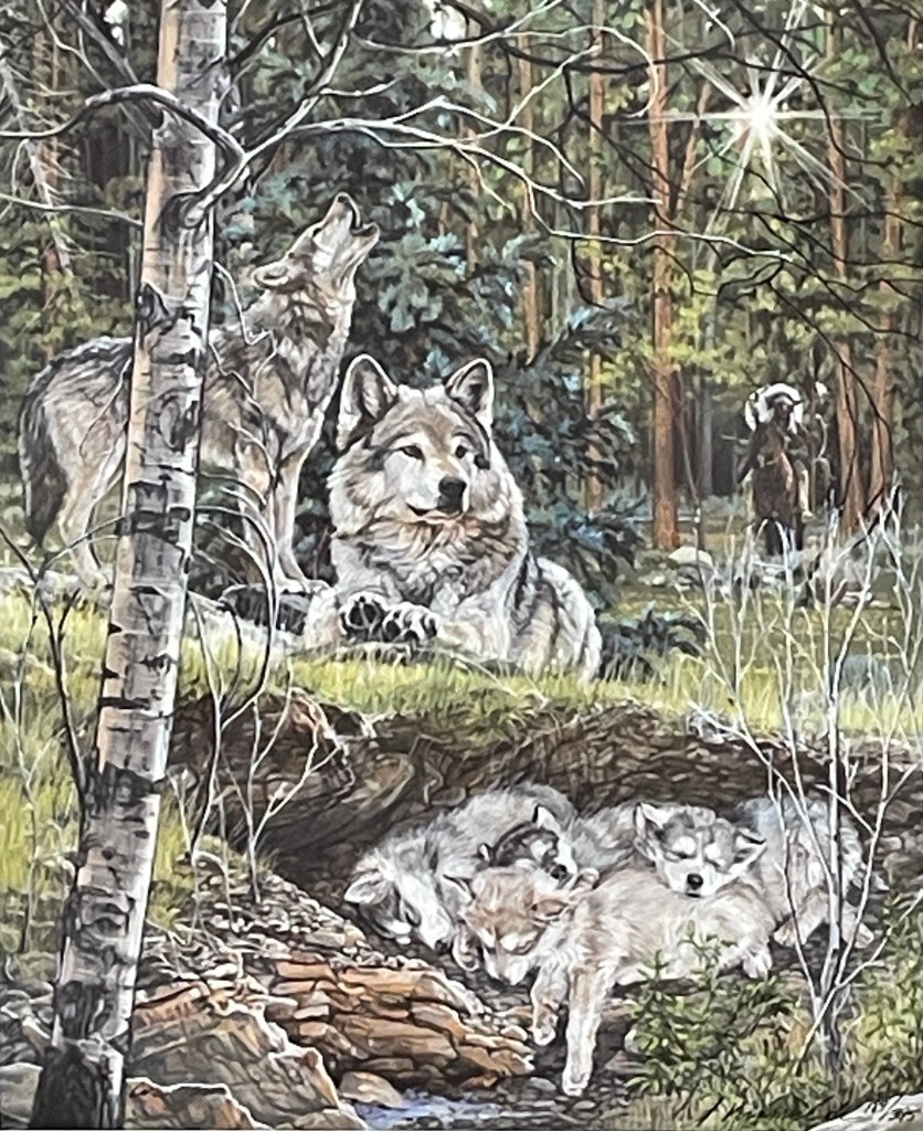 A quiet moment beneath the stars—Lullaby by Julie Kramer Cole captures the tender stillness of a forest night. Wolf pups sleep nestled in their den while the adults stand guard, one howling into the moonlit silence. This 16” x 12 ¾” lithograph on paper evokes protection, family, and the wild’s gentle rhythm. A timeless piece for collectors drawn to nature’s emotional resonance.
