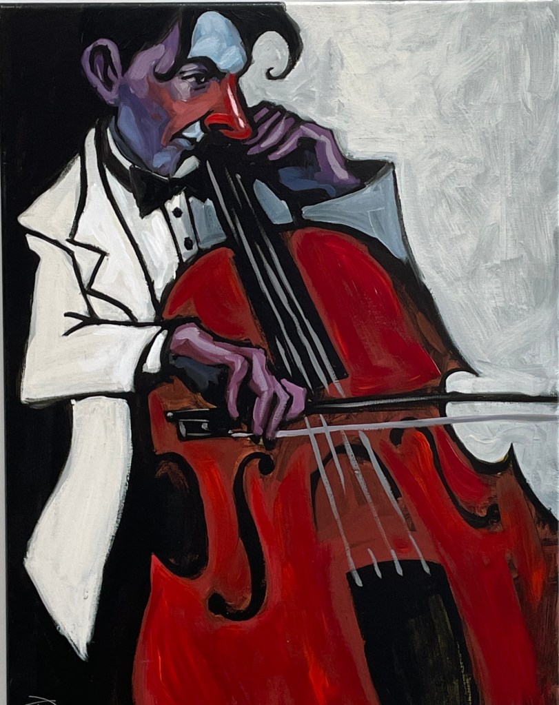 Bold, expressive, and full of character — Closing Time by Tim Rogerson transforms a musical moment into visual drama. A tuxedoed cellist, rendered in stylized strokes and vibrant hues, commands the spotlight with exaggerated features and rich contrast. The composition plays with light and shadow, capturing the emotion of performance and the intimacy of final notes. A standout piece for collectors who appreciate theatrical flair and modern abstraction.