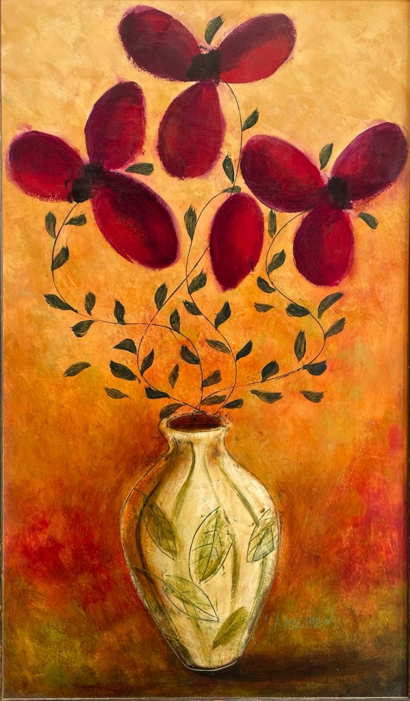 A bold floral composition rendered in rich encaustic, Loren Grey’s piece pulses with warmth and abstraction. The textured frame—dark, patterned, and subtly reflective—grounds the vibrant palette and adds a sense of depth and finish. A striking blend of organic form and modern color.