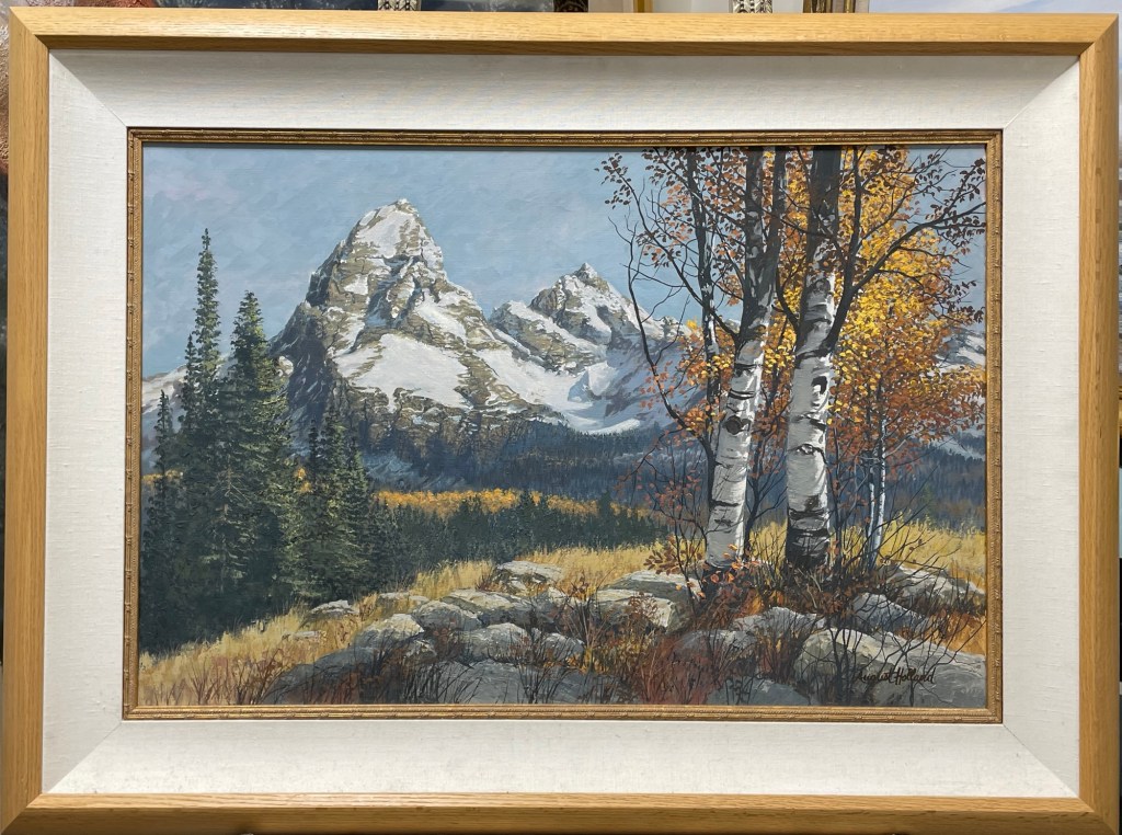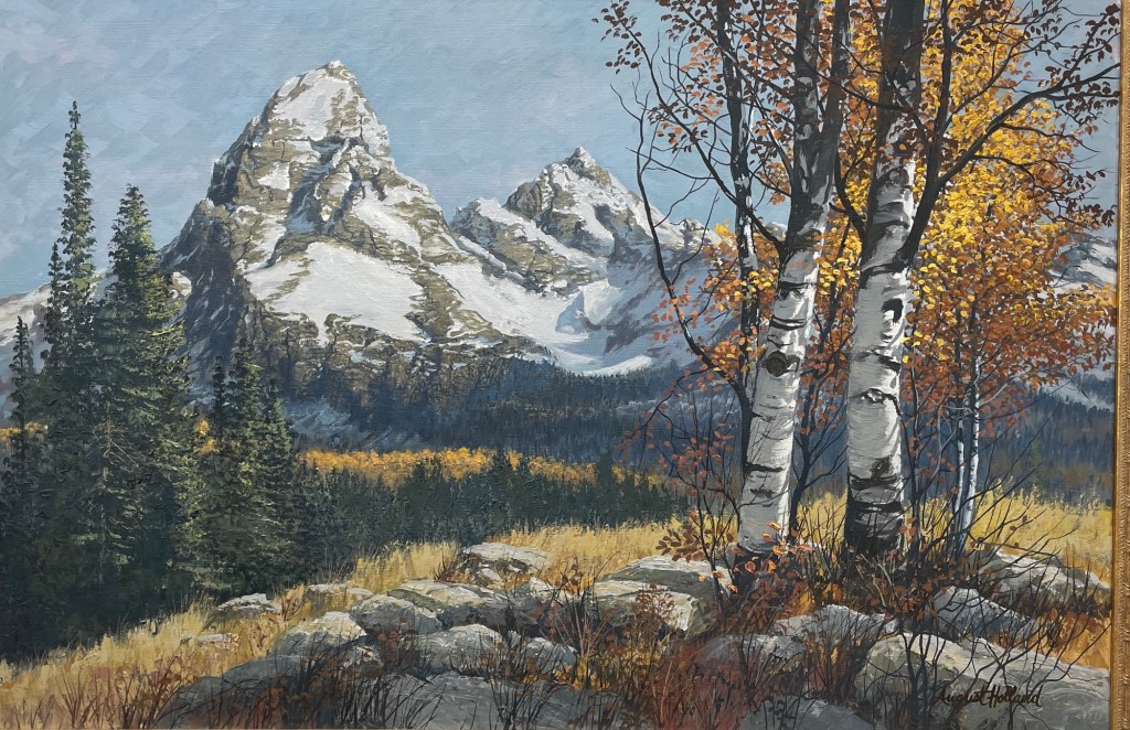 A golden hush settles over the Tetons in this sweeping autumn landscape by August Holland. With crisp birch trunks, snow-capped peaks, and a forest ablaze in fall color, Teton Fall invites reflection and reverence for nature’s changing rhythms.