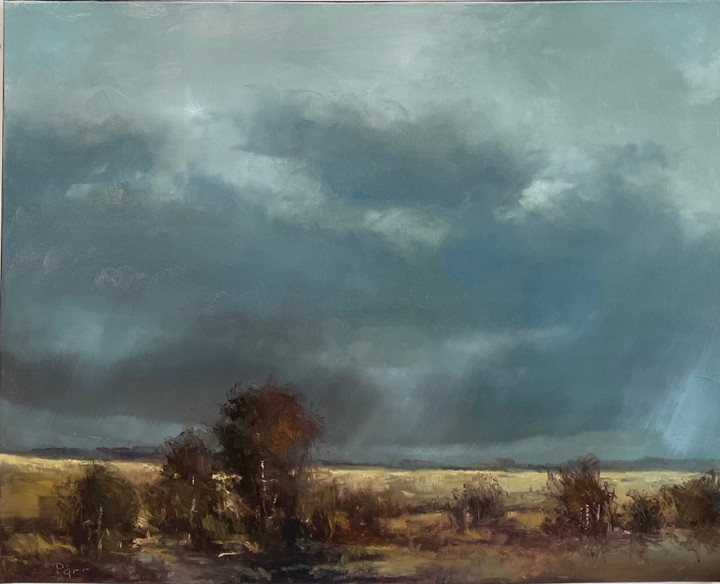 Stormlight gathers. In Before the Break, Brian Parr captures the charged stillness before nature shifts—where sky and land hold their breath in tandem. This 24” x 30” gallery-stretched oil on canvas evokes the weight of weather and the quiet resilience of the prairie below. A study in mood, motion, and elemental grace.