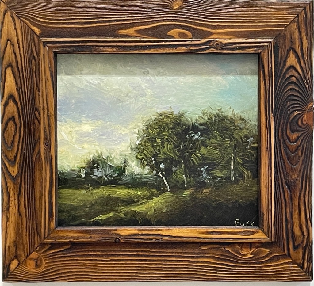 📣 A quiet field, a stand of trees, and the hush of a sky heavy with thought—Brian Parr’s Stillness Before the Rain captures the moment just before nature exhales. This 9” x 11” oil on panel invites the viewer into a landscape of textured calm, where muted greens and soft blues speak in whispers. Framed in rustic wood, the piece balances serenity with depth, echoing the timeless rhythm of the Midwest.