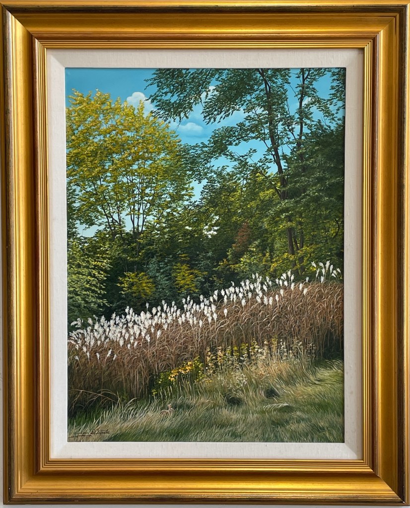 A quiet marvel of texture and light—Steele’s brushwork captures the feathery sway of late-season grasses beneath a crisp blue sky. This piece invites stillness, evoking the hush of a landscape between bloom and dormancy.