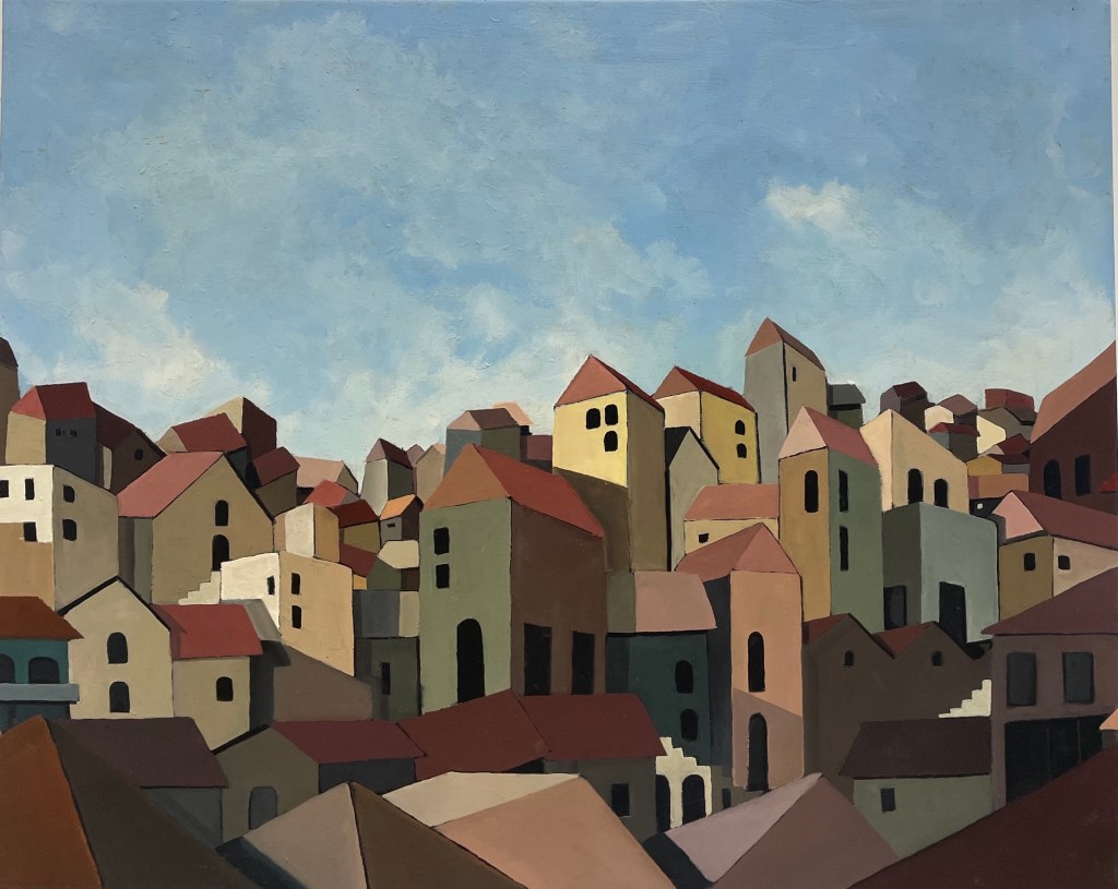 A hillside town imagined in layered geometry—where rooftops ripple like memory and buildings lean into each other like old friends. Chehak’s palette whispers in earth tones and soft reds, inviting quiet contemplation of urban rhythm and rural nostalgia.