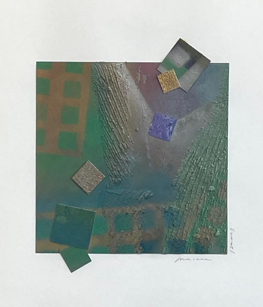 A radiant interplay of texture, geometry, and metallic shimmer—this piece invites close looking and layered interpretation. Bold yet balanced, it anchors the wall with quiet energy.