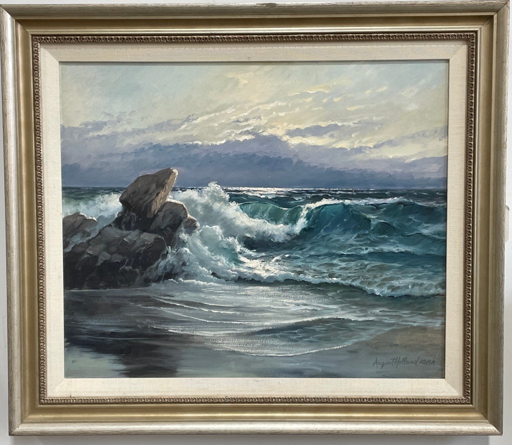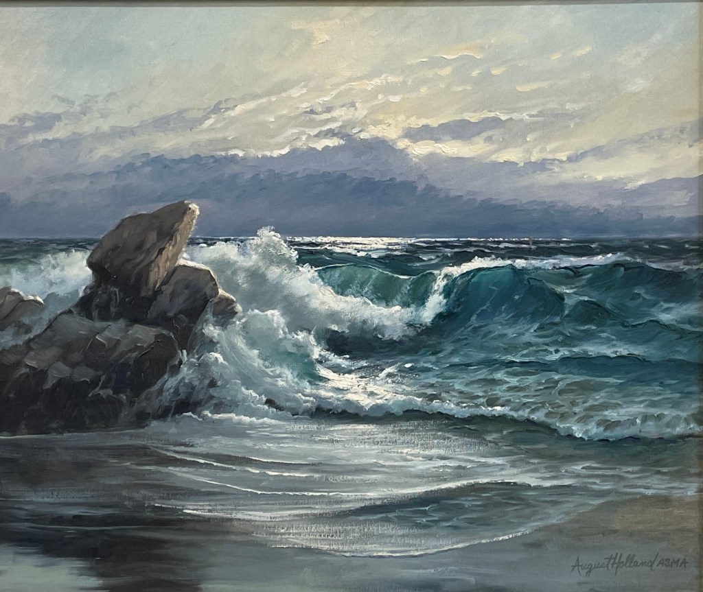 Art, Marine Art Breakers by August Holland ASMA Posted by kagwdm on December 10, 2025 20” x 24” oil on canvas A symphony of sea and sky—where jagged rocks meet crashing waves and light breaks through the storm. Holland captures nature’s raw power with cinematic intensity, balancing turbulence with transcendence. Share this: Click to share on X (Opens in new window) X Click to share on Facebook (Opens in new window) Facebook More Click to email a link to a friend (Opens in new window) Email Click to share on Threads (Opens in new window) Threads Like Loading...