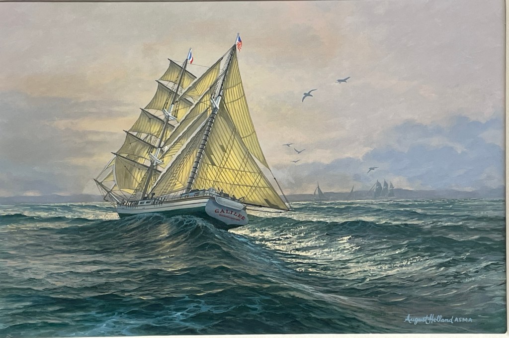 Sunlight breaks through a restless sky as the GALILEE sails into view—its rigging taut, its sails aglow, its course unwavering. Holland’s masterful brushwork captures not just the motion of the sea, but the spirit of adventure itself. A tribute to maritime grace and the timeless pull of the horizon