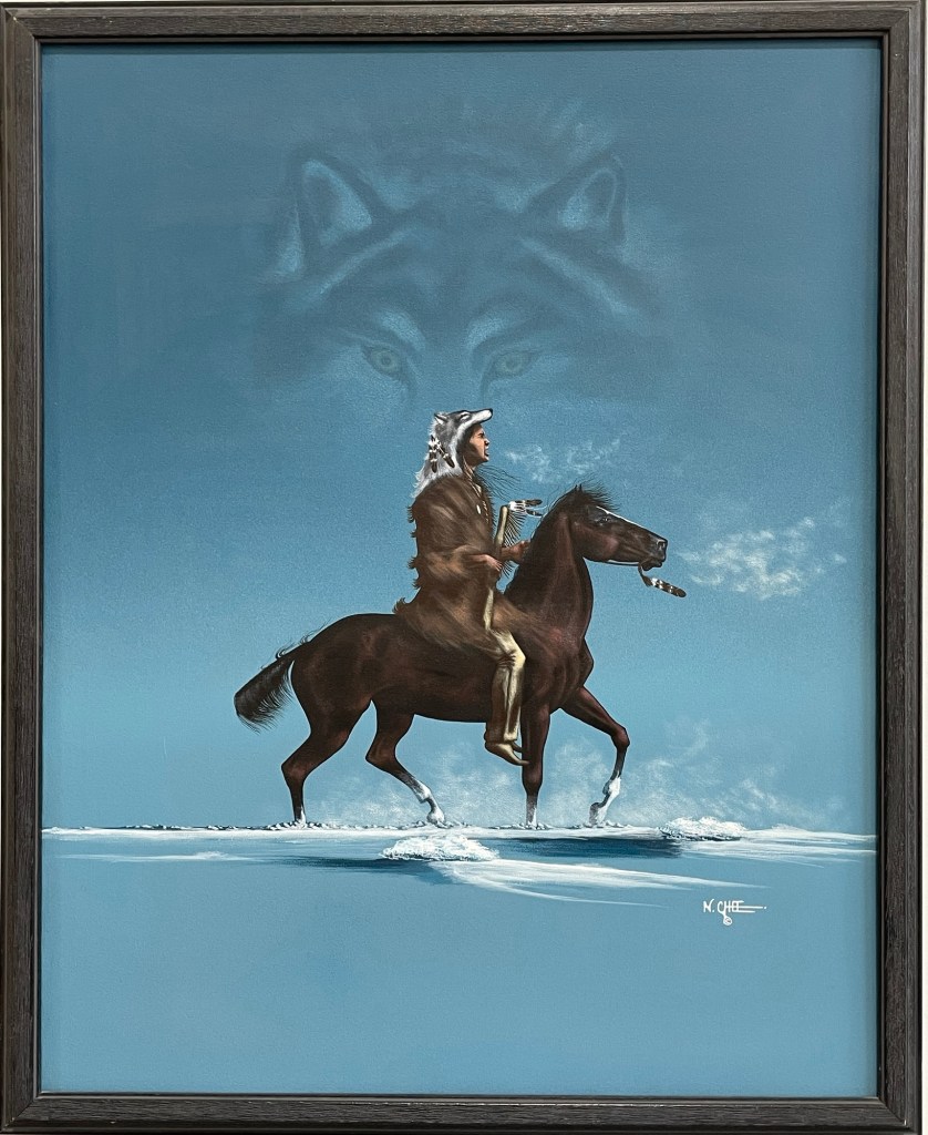A lone rider crosses the snowbound plains, cloaked in ancestral strength. The wolf spirit watches from above—guardian, guide, and echo of resilience. Chee’s brushwork evokes motion and mysticism, grounding Native tradition in the hush of winter.