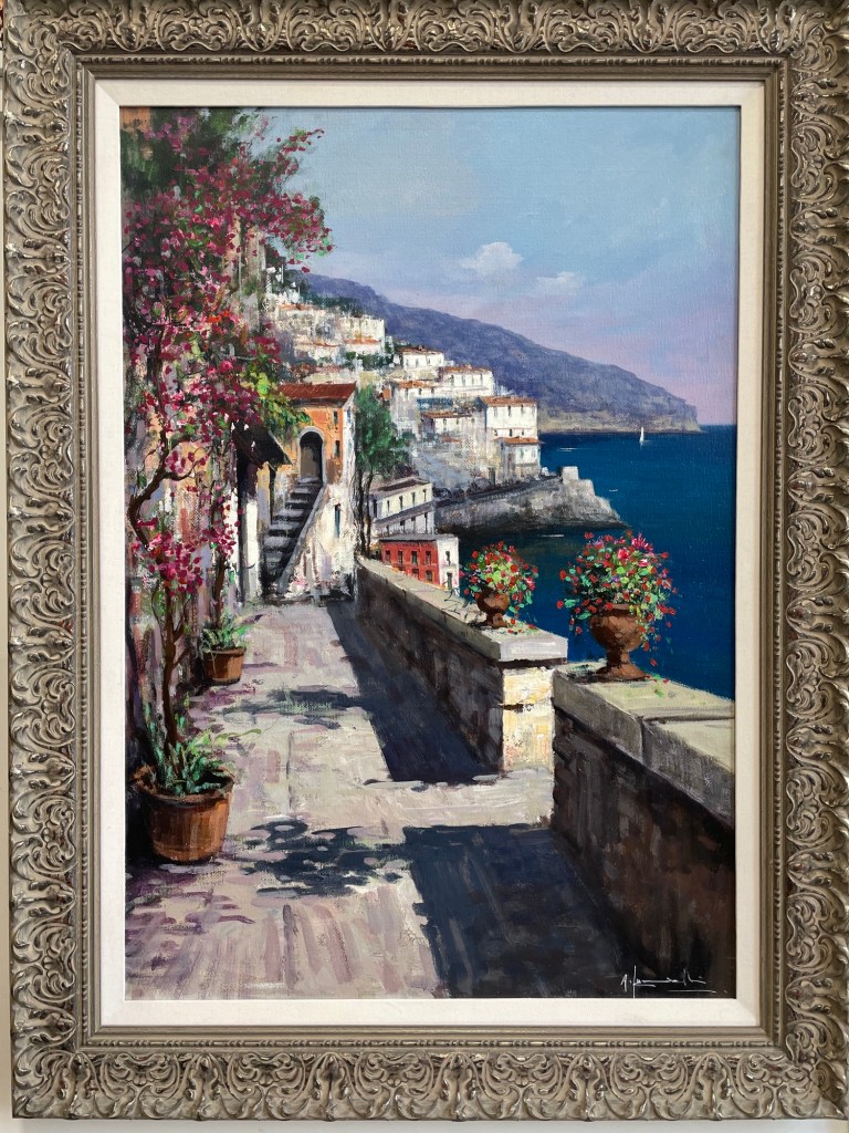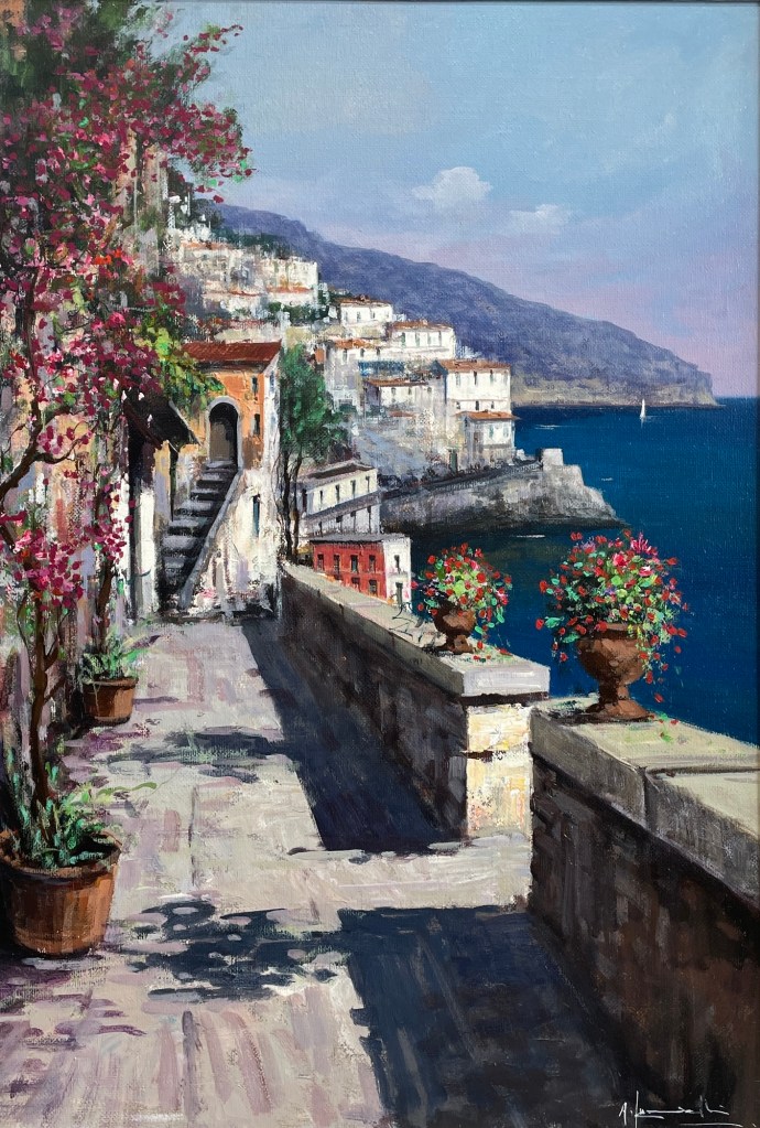 A sunlit stone path leads the eye through flowering terraces and warm hillside dwellings, cascading toward the deep blue sea. Iannicelli’s brushwork evokes the serenity of Mediterranean life—where sailboats drift and time slows. A timeless invitation to wander.