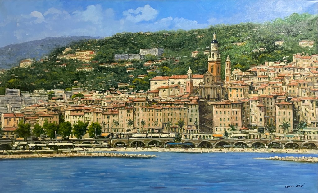 A sweeping view of the Mediterranean coast, Nuetone captures the timeless charm of red-tiled rooftops, sunlit arches, and a serene harbor. Claudio Ciardi’s brushwork is both precise and poetic—rendering architectural detail with warmth and nostalgia. Whether Portofino, Positano, or a dreamlike blend of both, this piece invites the viewer into a tranquil moment by the sea.