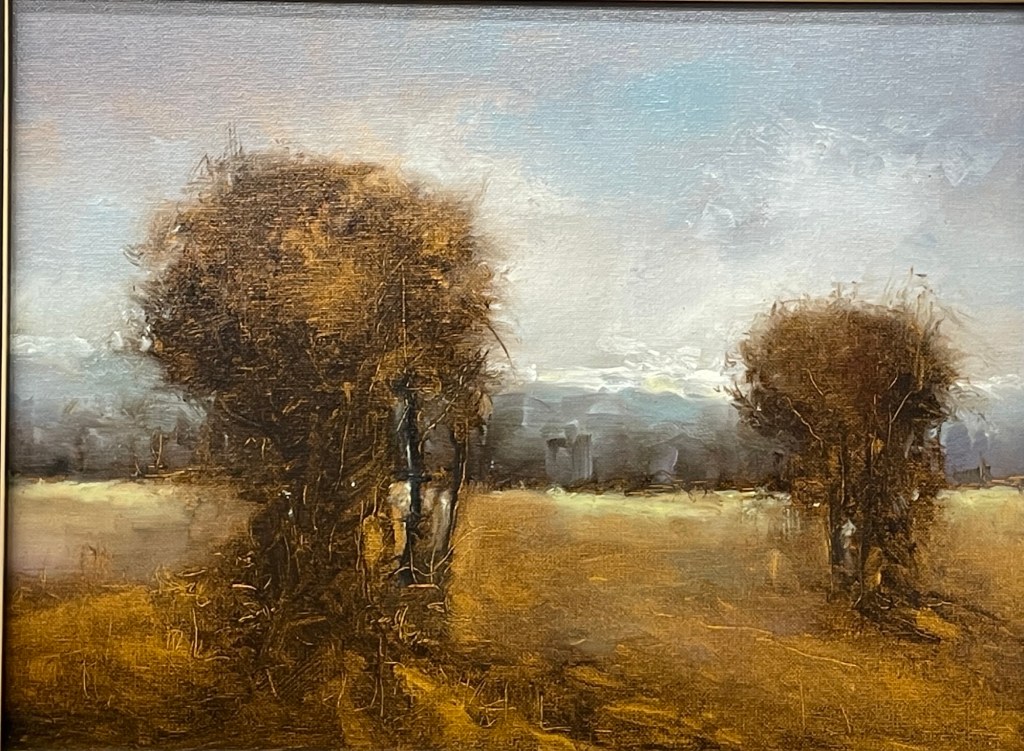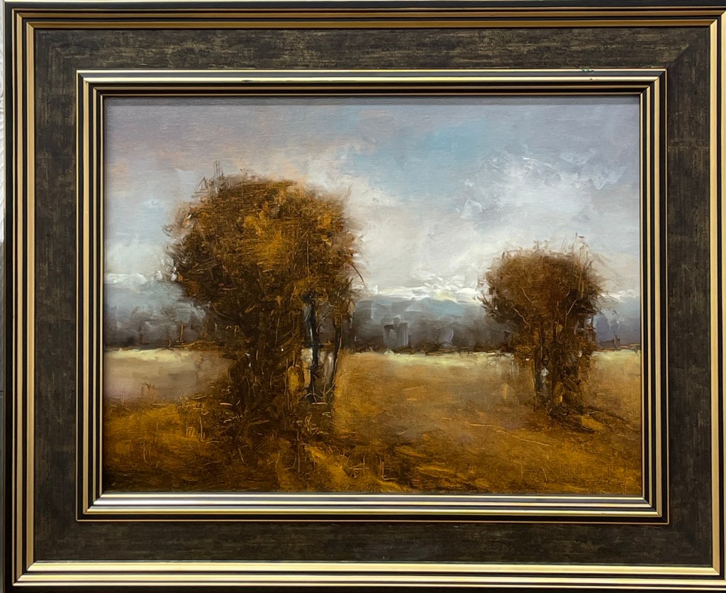 Two trees, one moment—held in the hush of late autumn. Brian Parr’s brushwork invites you into a landscape where texture becomes memory and color becomes mood. This 12” x 16” oil on panel balances solitude and connection, with earthy tones and a sky that hints at change.