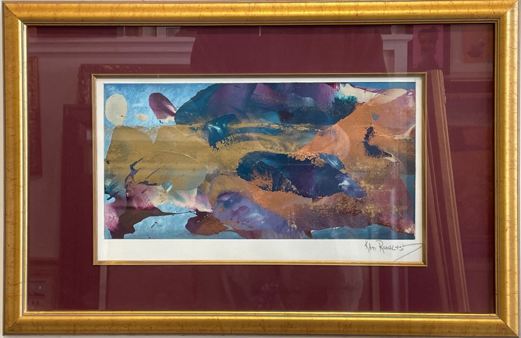 A shimmer of memory, a rush of movement—Echoes Between Color invites you to linger in the in-between. Kati Roberts blends gold, violet, and cobalt in this 8” x 16” mixed media on paper, creating a composition that hums with layered emotion and quiet boldness.