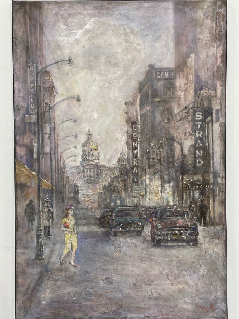 A nostalgic look down Locust Street in the early 1950s, where the Strand Theatre’s marquee and the Capitol dome anchor the scene. Proykov’s impressionistic brushwork captures the rhythm of city life—classic cars, muted tones, and the quiet hum of midcentury Des Moines.