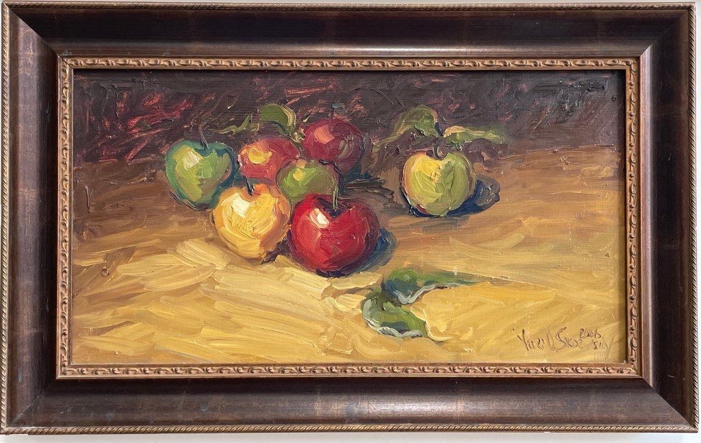 A lush meditation on color and form—Skorupsky’s apples pulse with life, each stroke thick with intention. The composition balances vibrancy and restraint, inviting the viewer into a moment of quiet abundance.