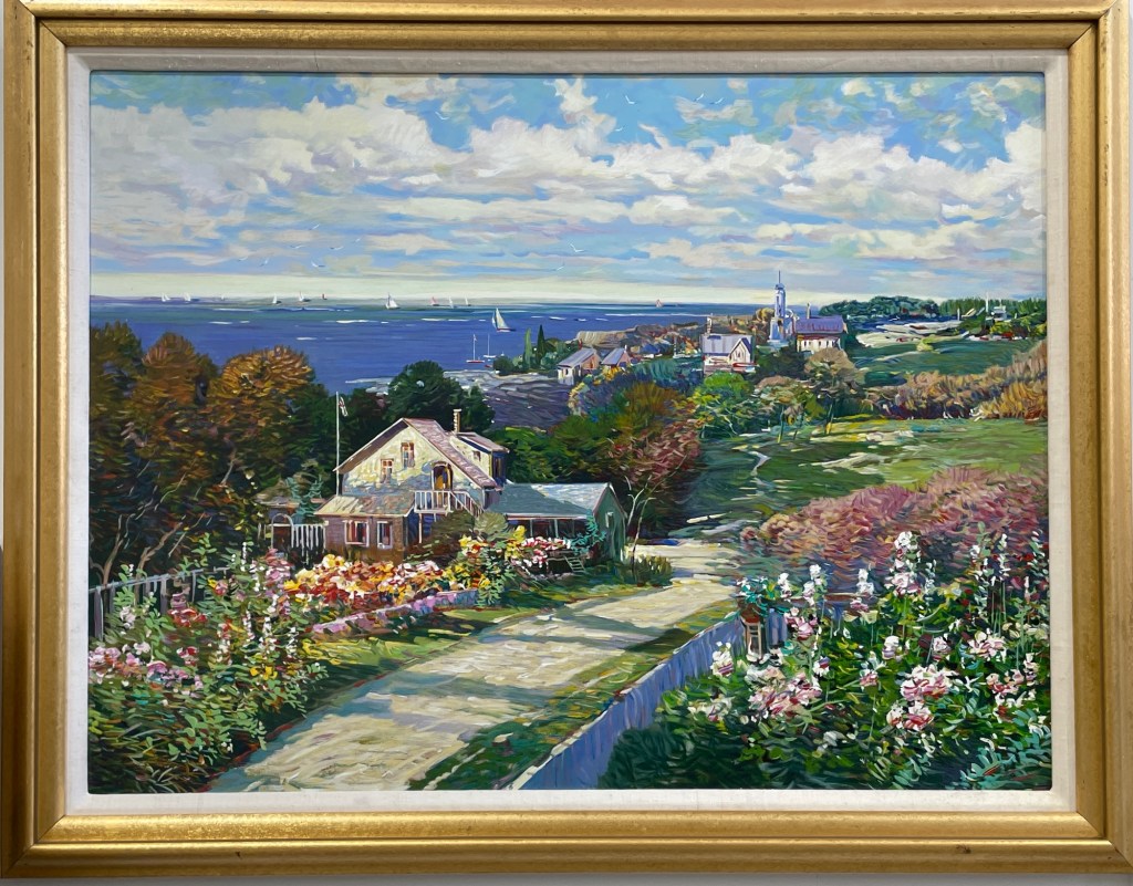 A sunlit coastal village unfolds in vivid color—stone paths, blooming gardens, and sailboats drifting beyond the steeple. Ming Feng’s romantic impressionism evokes the warmth of seaside life with painterly precision and emotional depth.