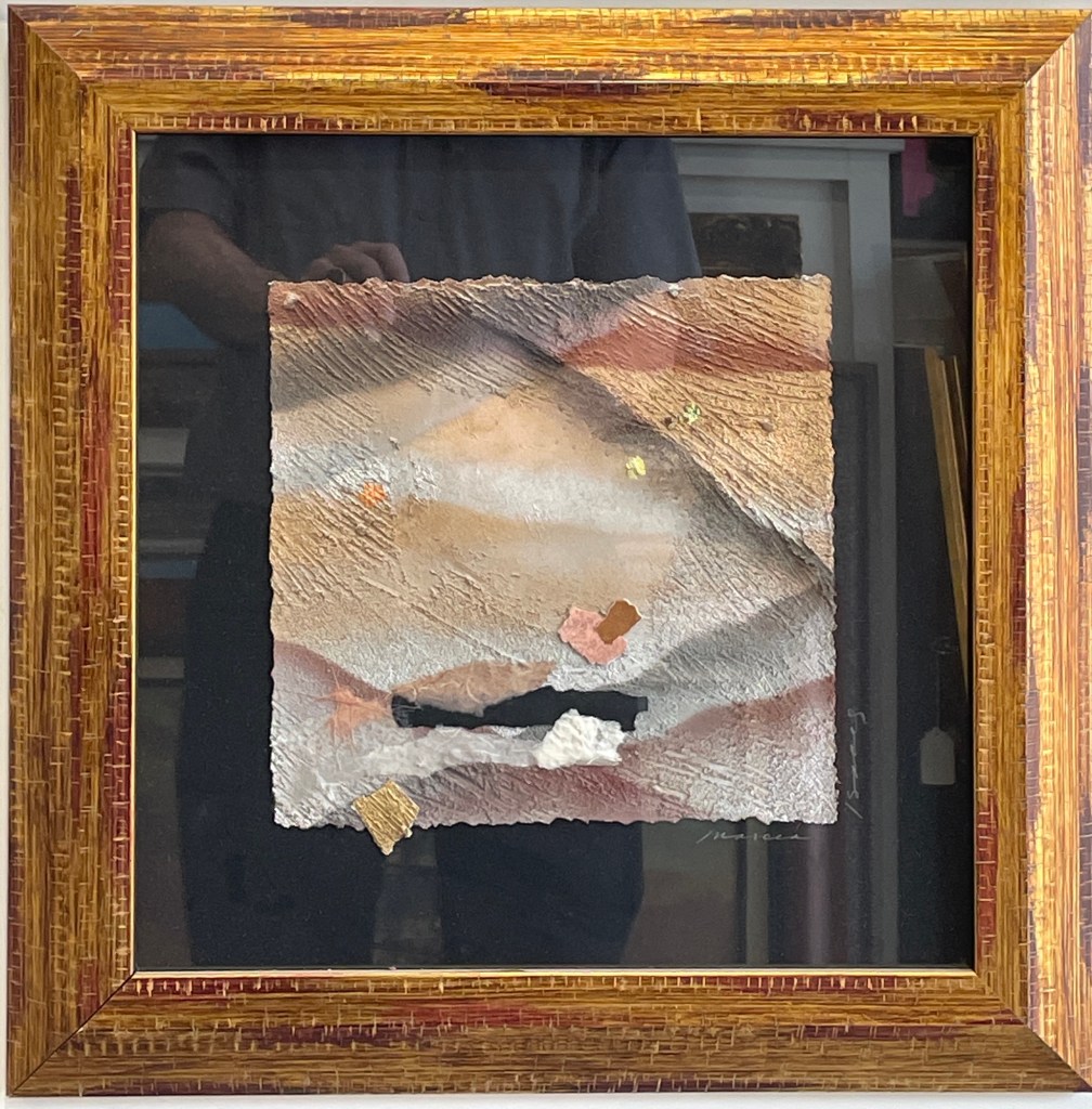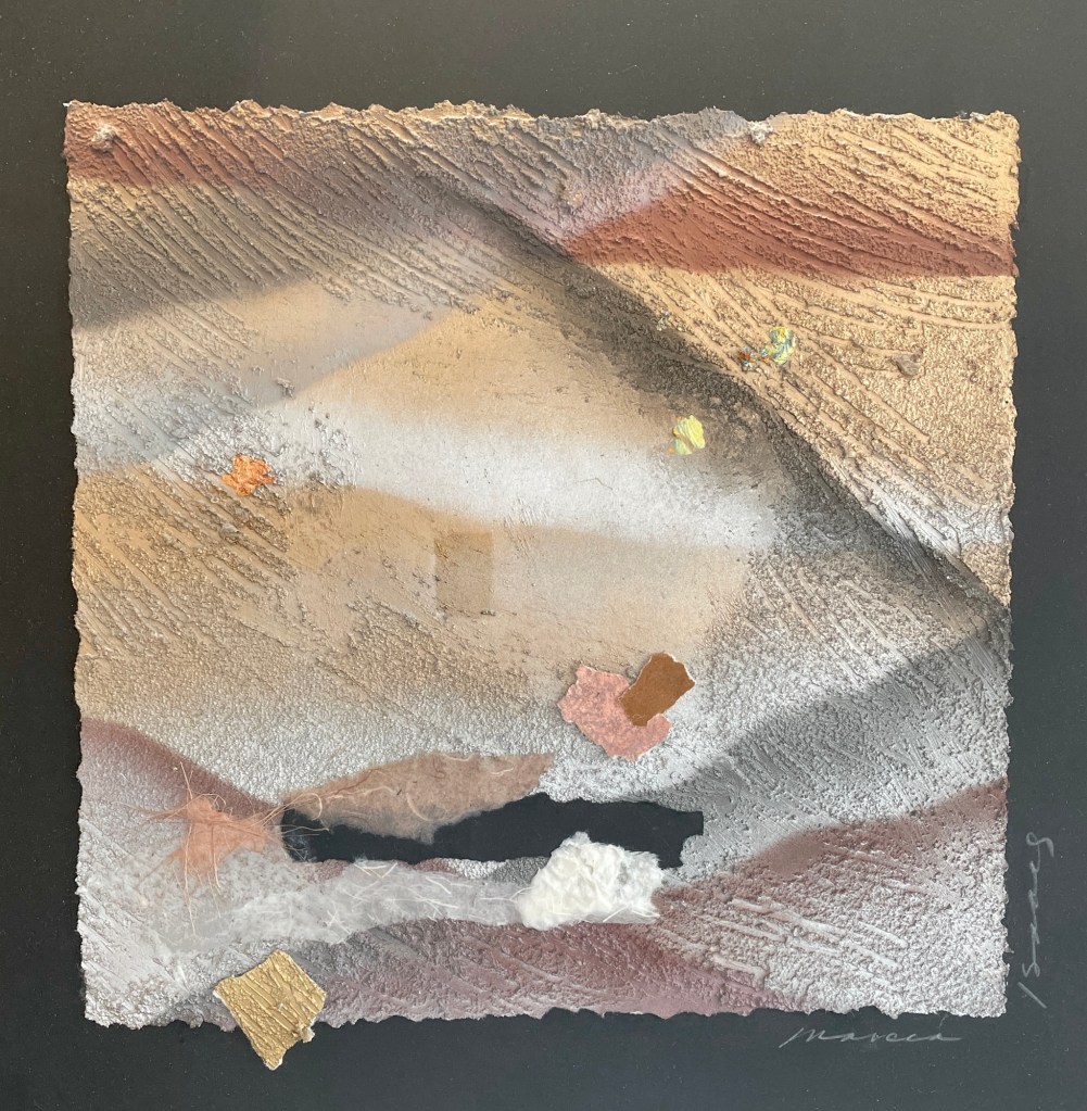 A meditation in texture—where metallic glints meet fibrous hush, and strata shift like memory. Isaacs layers earth tones and cotton-like softness into a quiet upheaval, inviting the viewer to trace the fault lines of feeling and form.