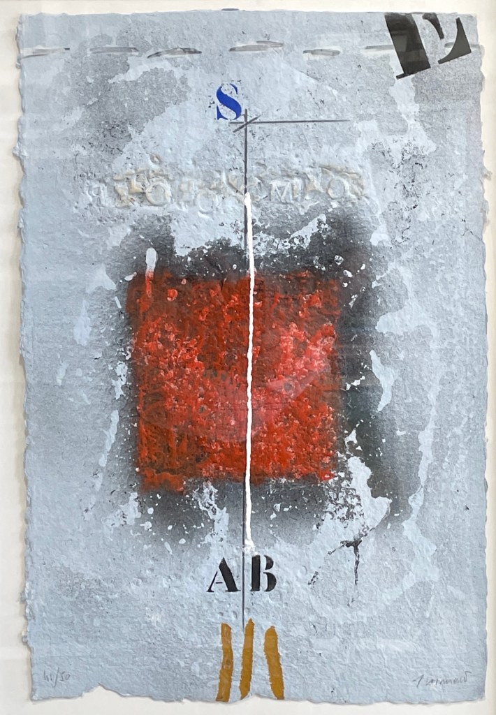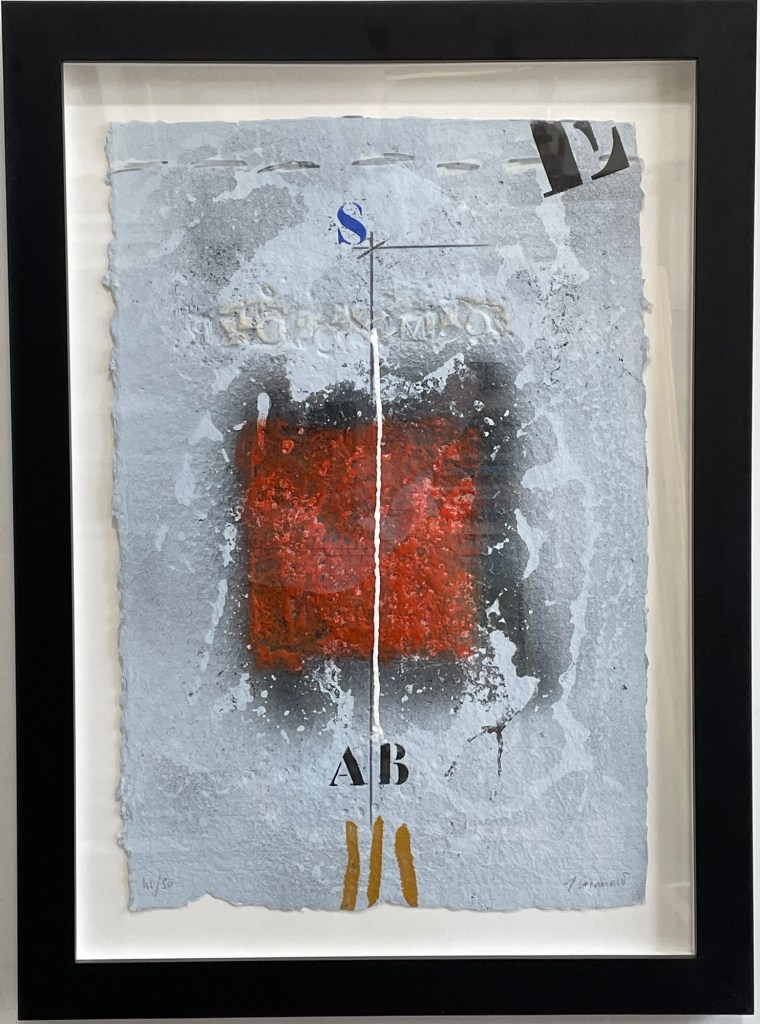 In Rouge S-AB, Coignard’s visual lexicon shifts from blue to red—retaining the fractured geometry, symbolic “S,” and enigmatic “AB” while deepening the emotional register. Floated in a black wood cube frame, this signed edition invites collectors to explore a language of texture, color, and coded form.