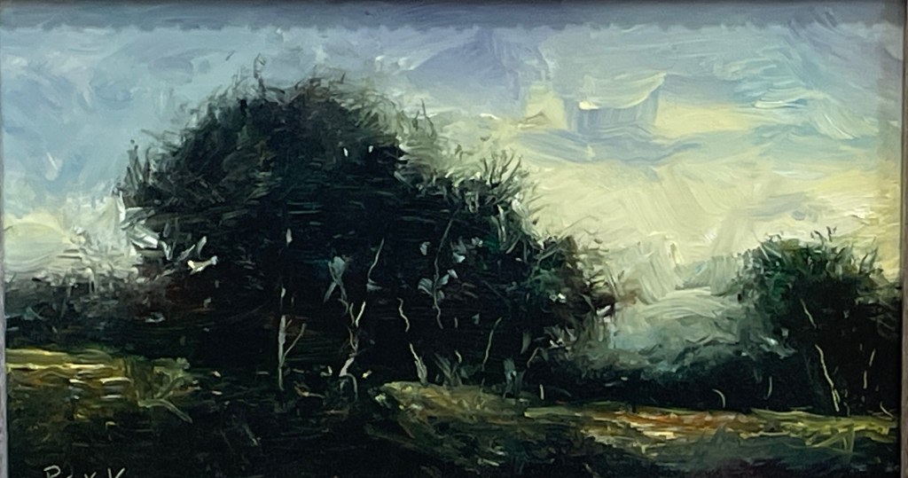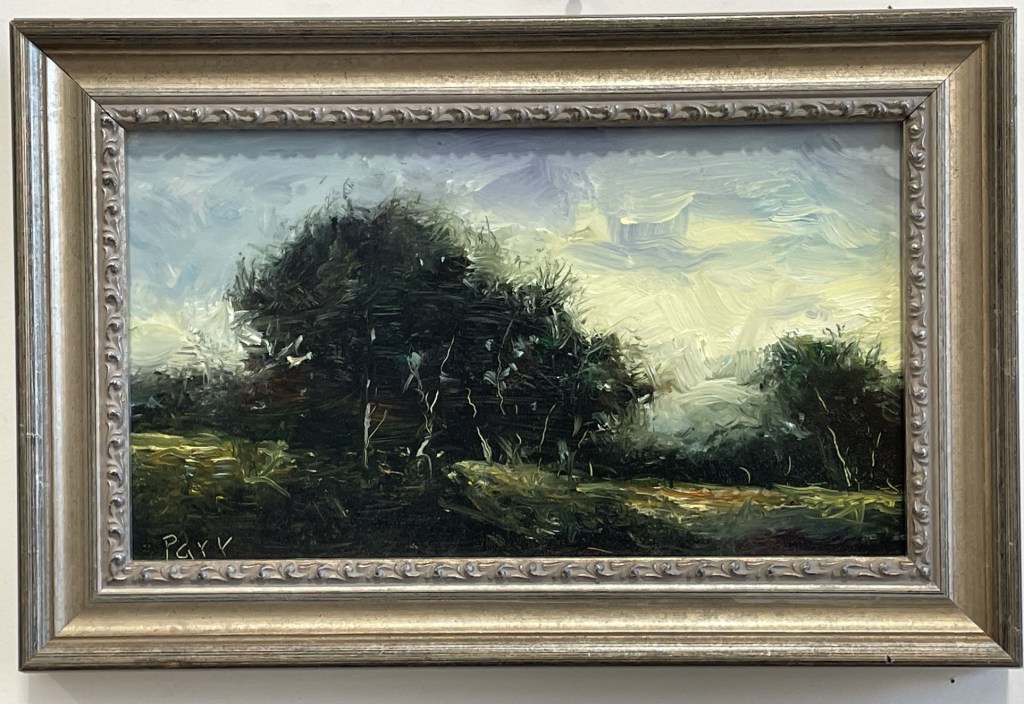 A contemplative landscape from Brian Parr, where dense trees meet a sky in motion. Expressive brushwork and layered greens evoke a hush in the natural world—a moment suspended between wind and stillness. Framed and ready to anchor a quiet corner.